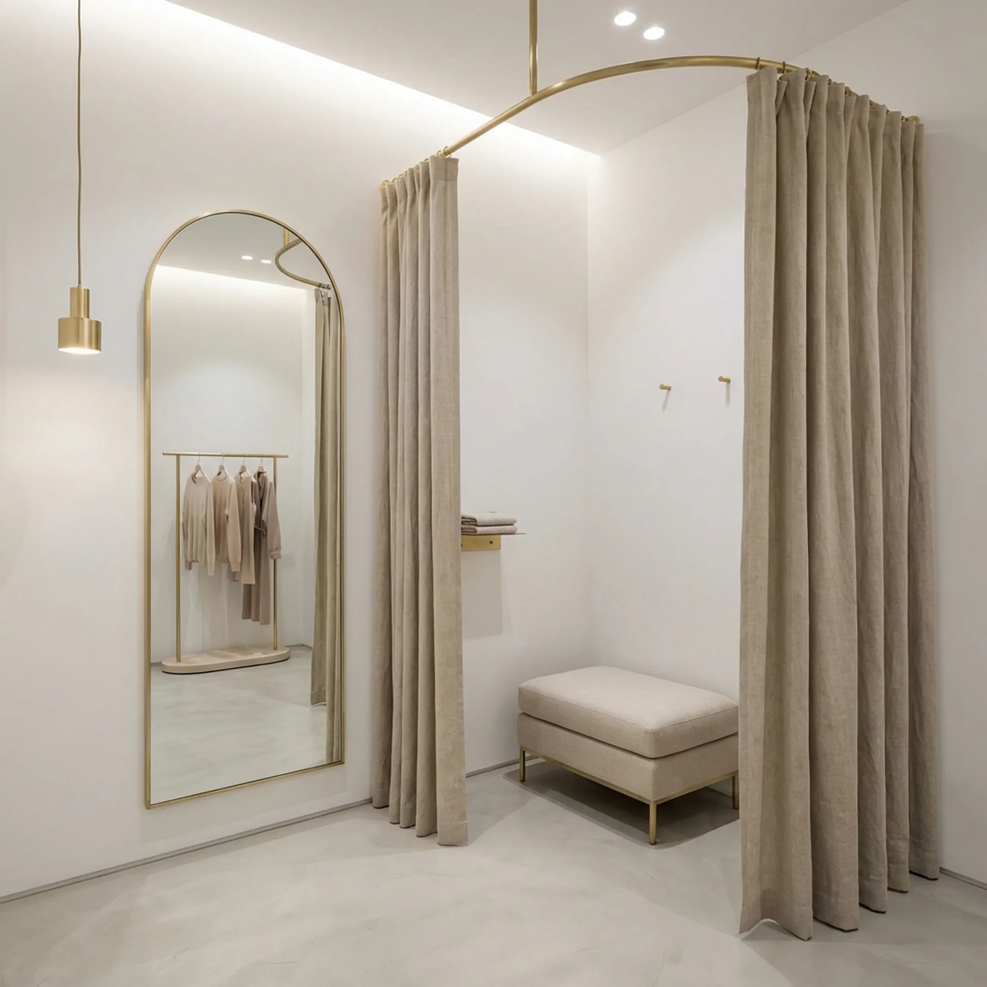Probne kabine sa zakrivljenim mesinganim šipkama, lanenim zavesama i tapaciranim klupama pružaju luksuzno iskustvo kupovine. Paleta boja - bela, bež i zlatna - ističe proizvode kao umetnička dela.