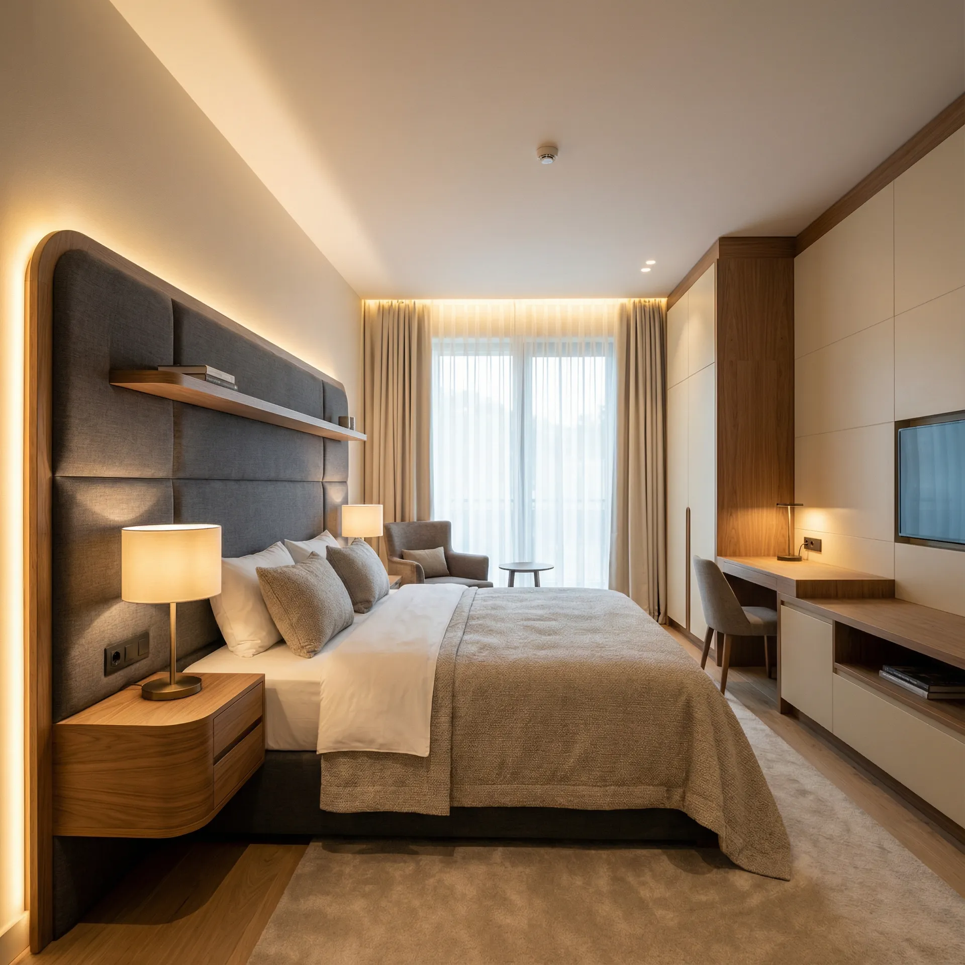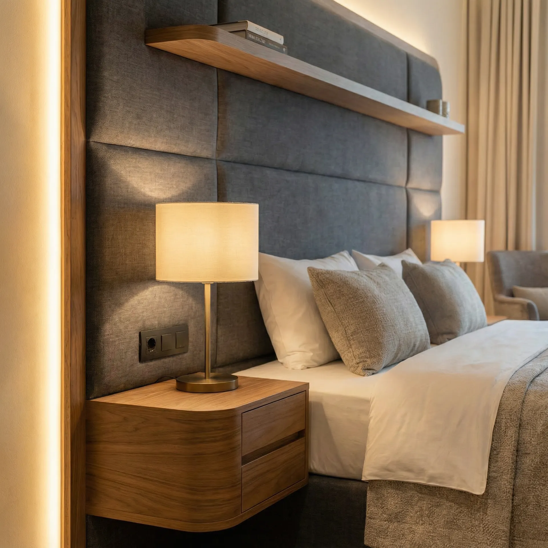 Kompletna oprema hotelske sobe sa tapaciranim sivim uzglavljem koje ima integrisane lebdeće noćne ormariće i USB punjače. Ambijentalno LED osvetljenje iza uzglavlja stvara toplu atmosferu.