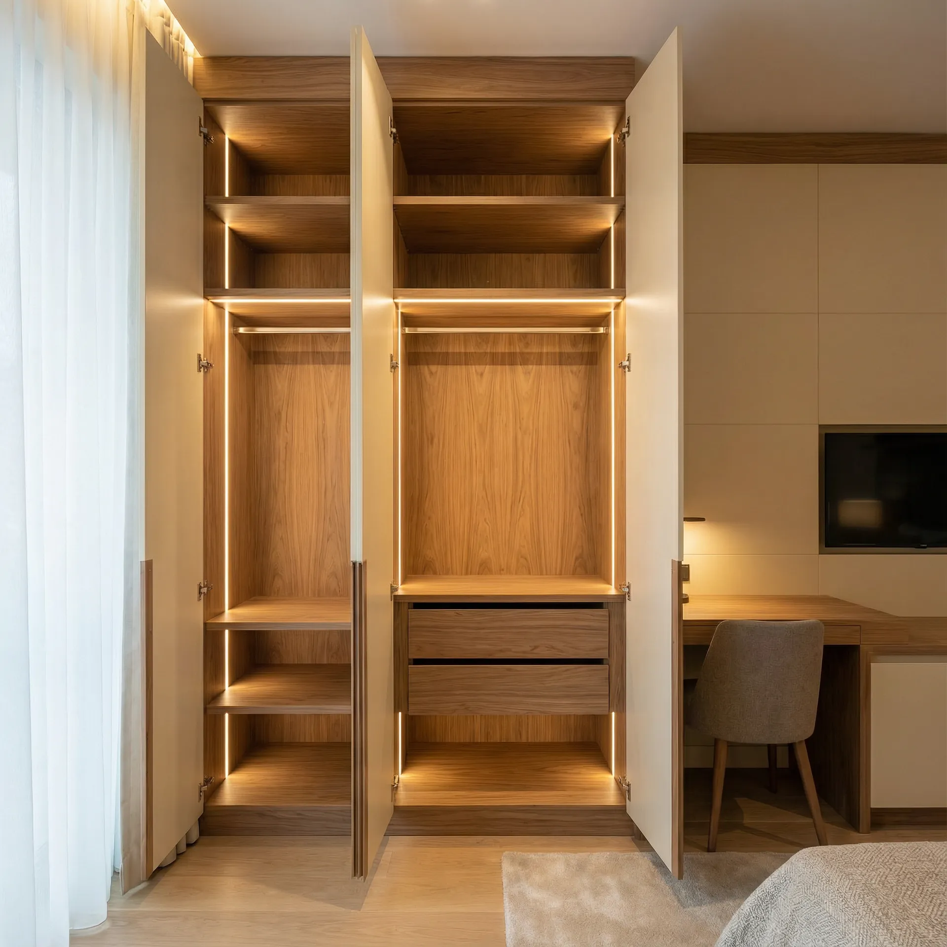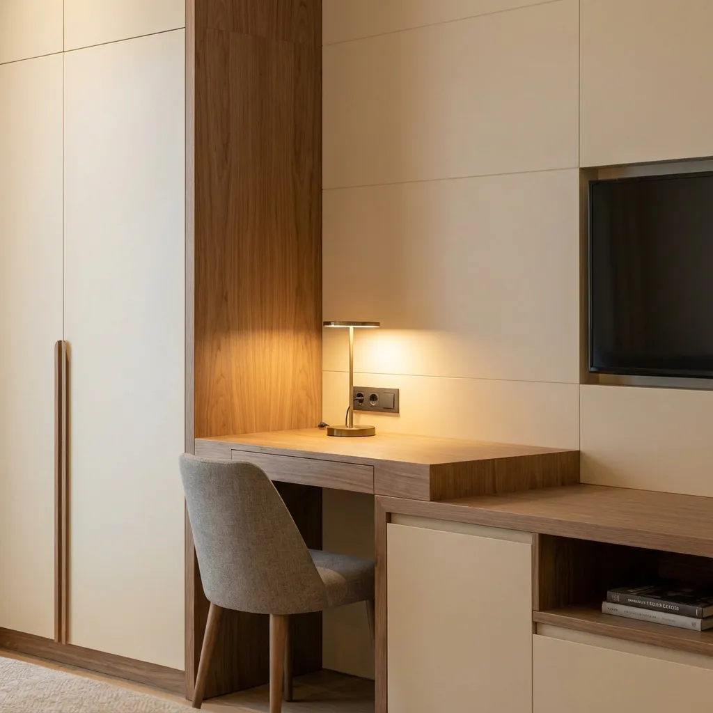 Radni kutak kombinuje sto od hrasta sa HPL elementima i TV konzolom. Ugradbeni ormar sa LED osvetljenim policama, fiokama i sefom pruža organizovano odlaganje za goste.