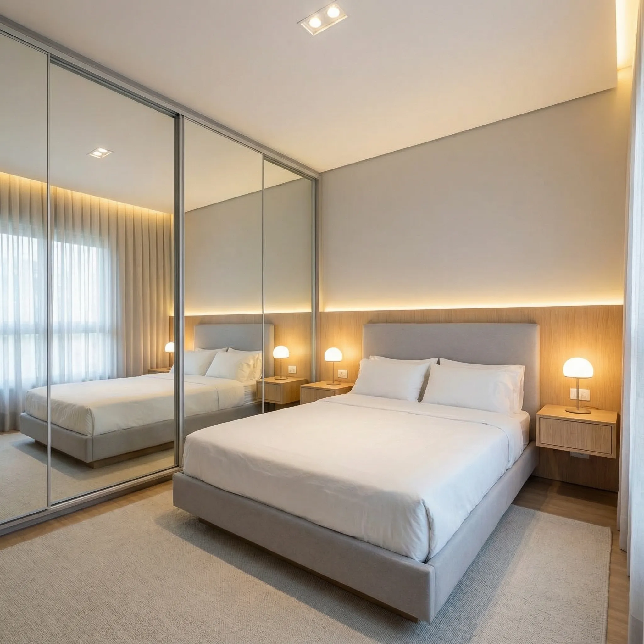 Klizni ormari od zida do zida, integrisano uzglavlje i noćni ormarići. Kompletno rešenje za spavaću sobu.