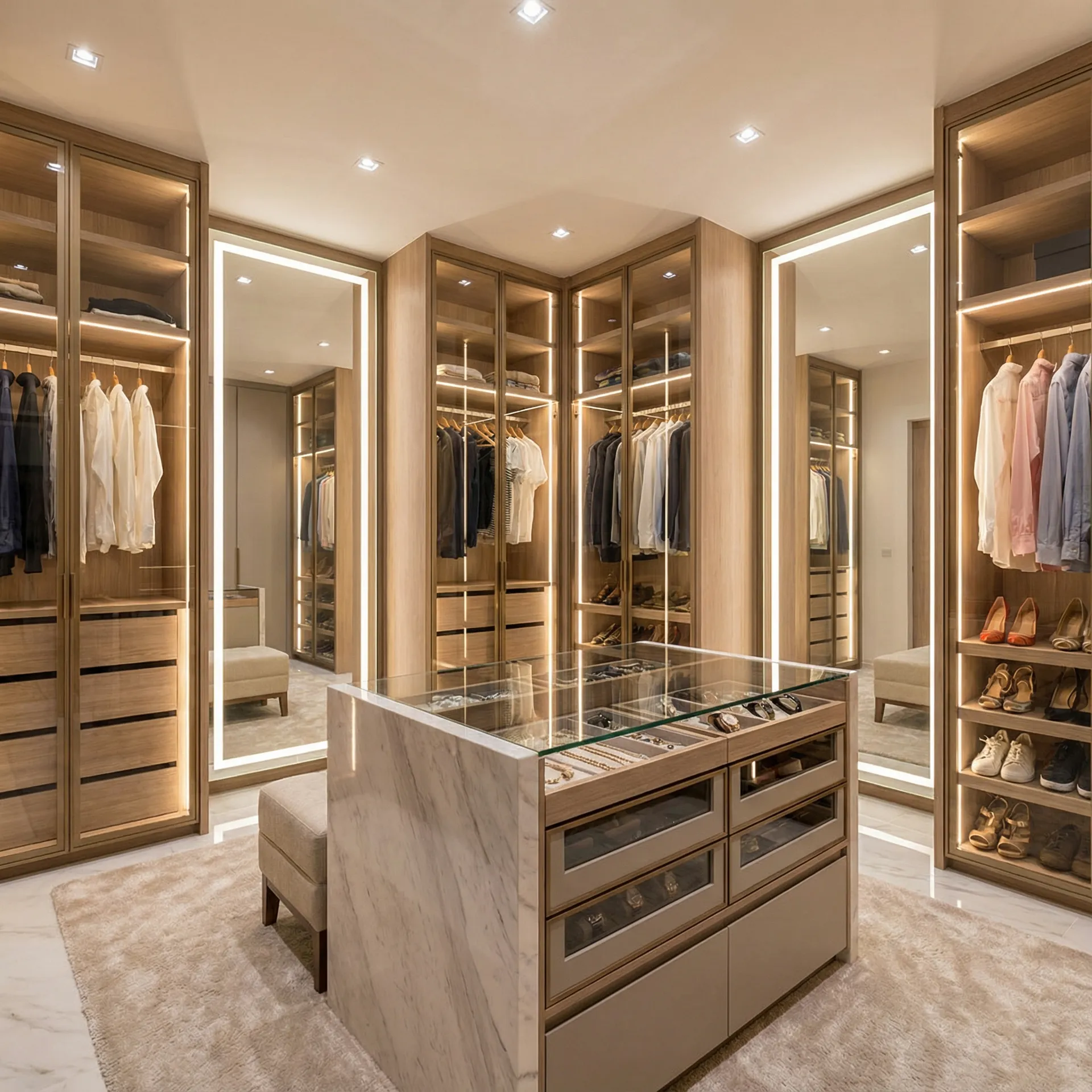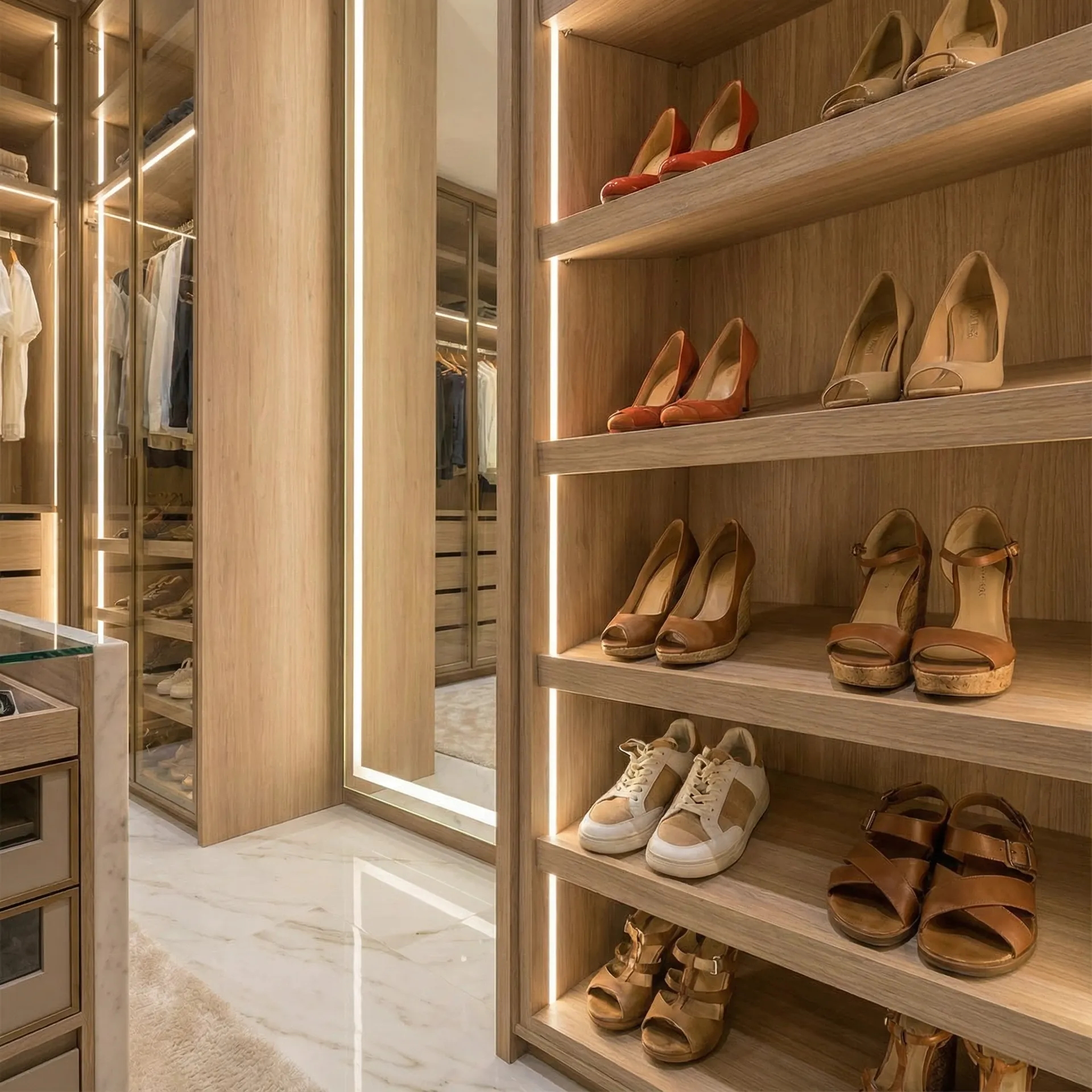 Duž zidova su staklene vitrine sa LED osvetljenjem koje daju pregledan prikaz celokupne garderobe. Posebna sekcija sa osvetljenim policama predviđena je za kolekciju obuće.