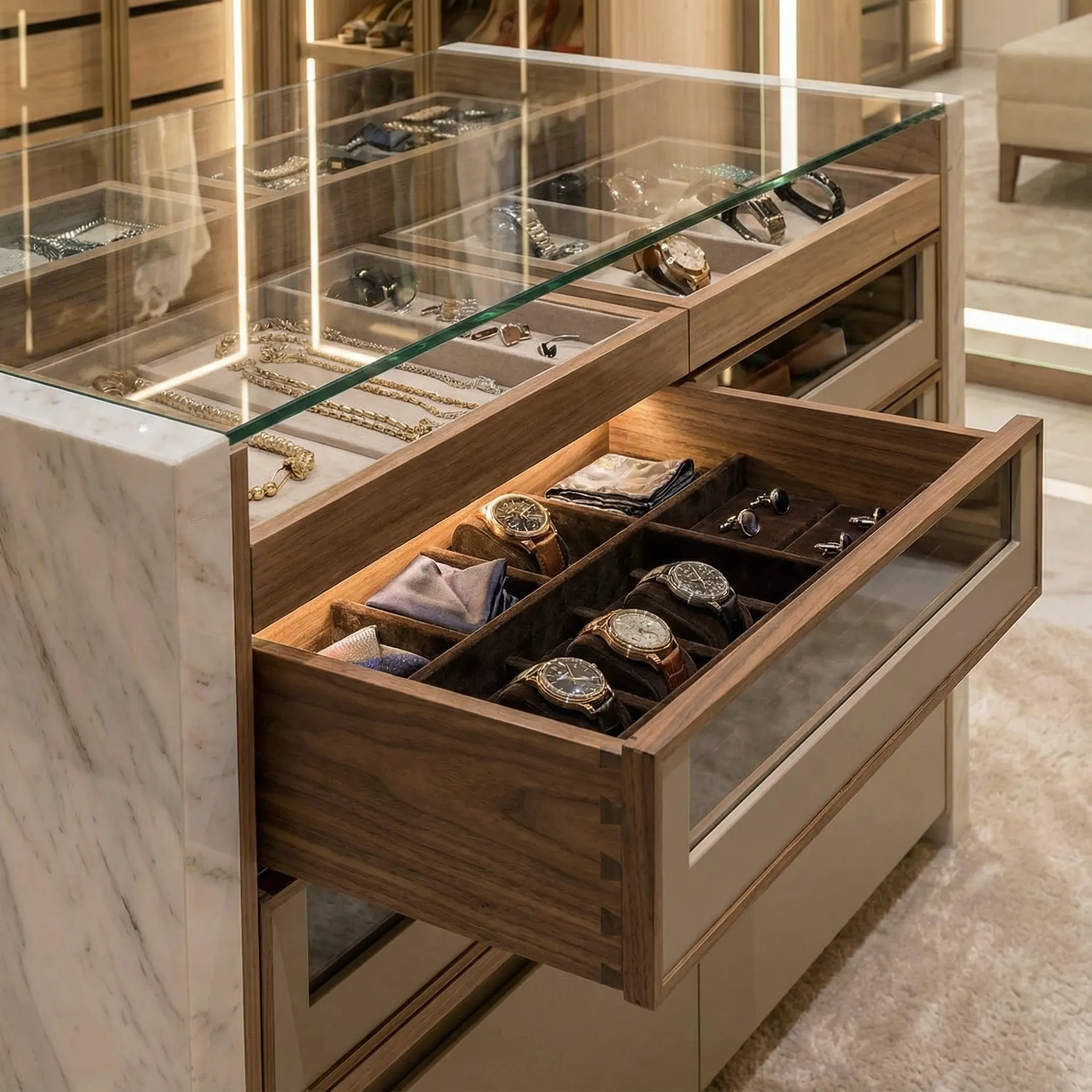 Prostrana garderobna soba sa centralnim ostrvom od mermera za organizaciju i pripremu aksesuara. Ostrvo ima stakleni vrh sa pregradama za nakit i satove, i duboke fioke obložene baršunom.