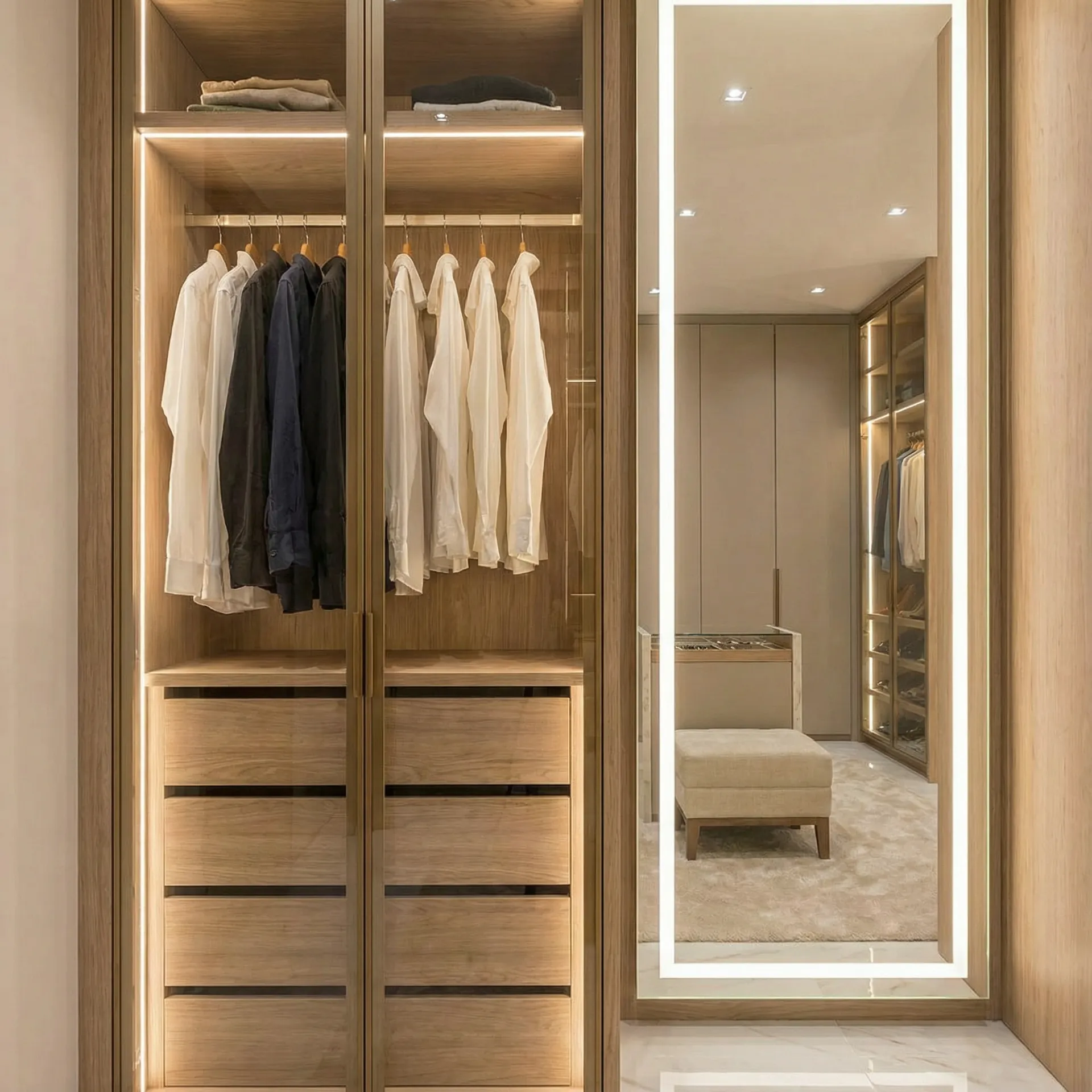 Ogledalo u punoj visini sa LED okvirom dopunjuje prostor, dok topli tonovi hrastovine i krem nijanse uz ugradnu rasvetu daju prijatan ambijent za svakodnevnu upotrebu.