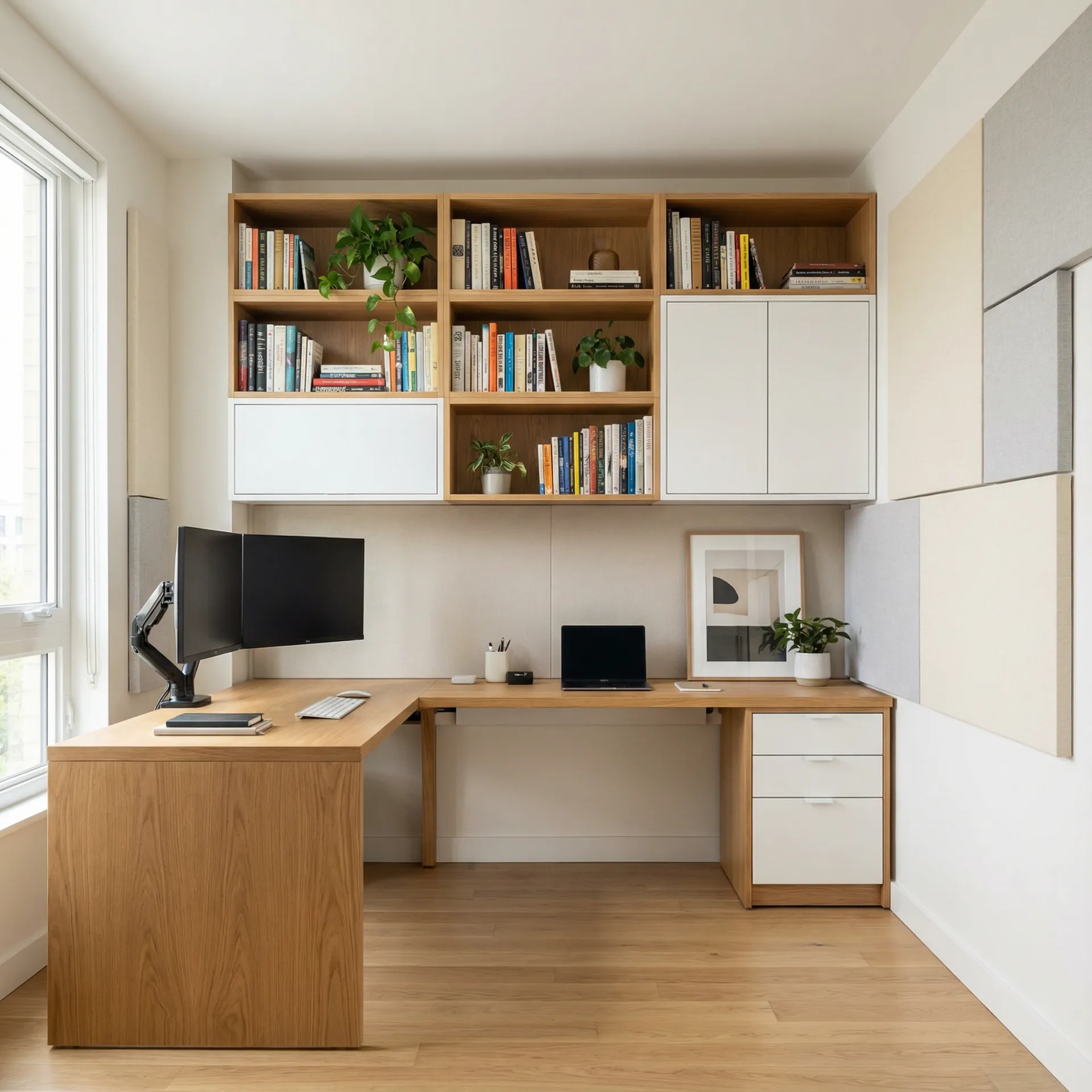 Sivi akustični paneli na zidu smanjuju eho i poboljšavaju kvalitet zvuka tokom online sastanaka. Prirodno svetlo kroz prozor i neutralna paleta boja stvaraju produktivno radno okruženje.