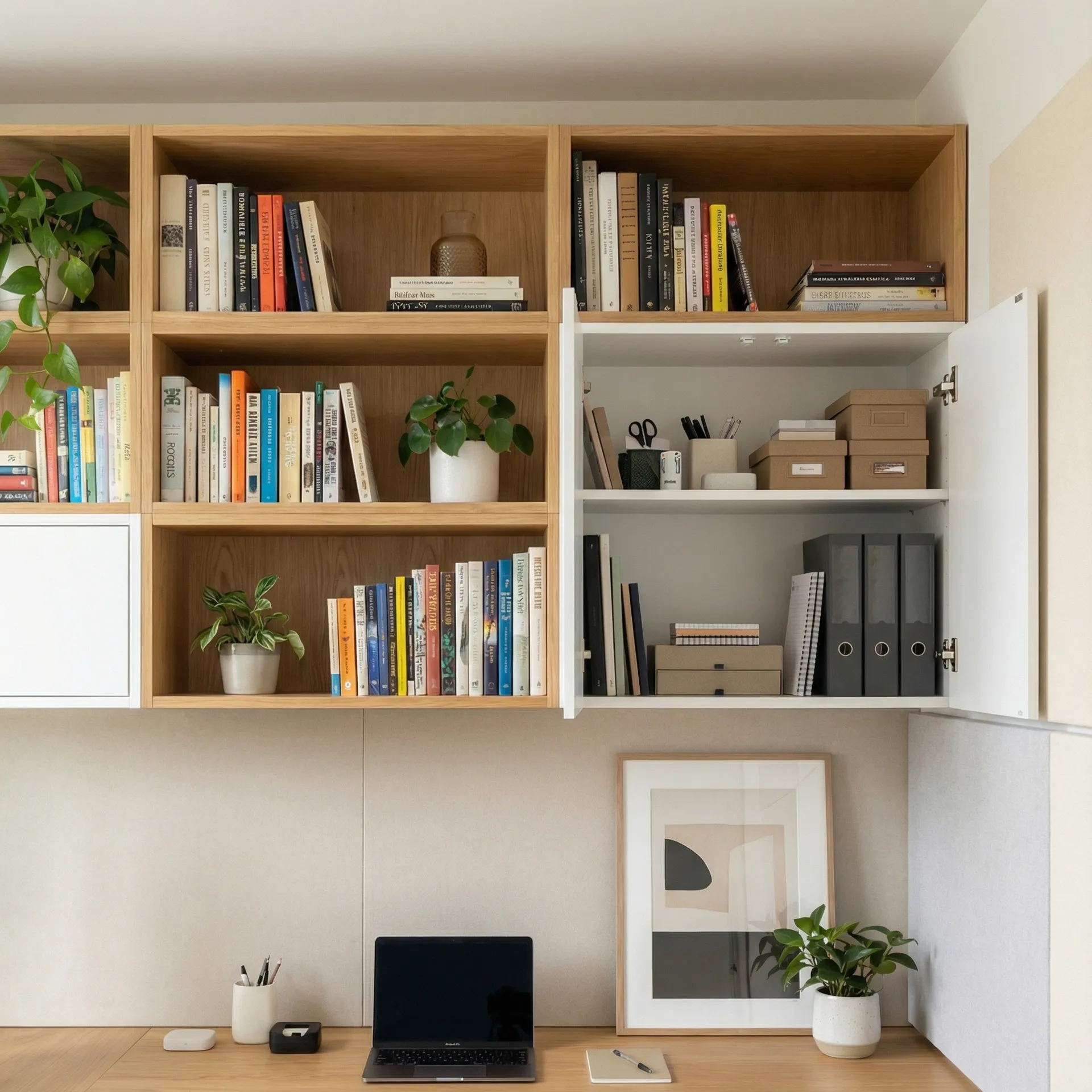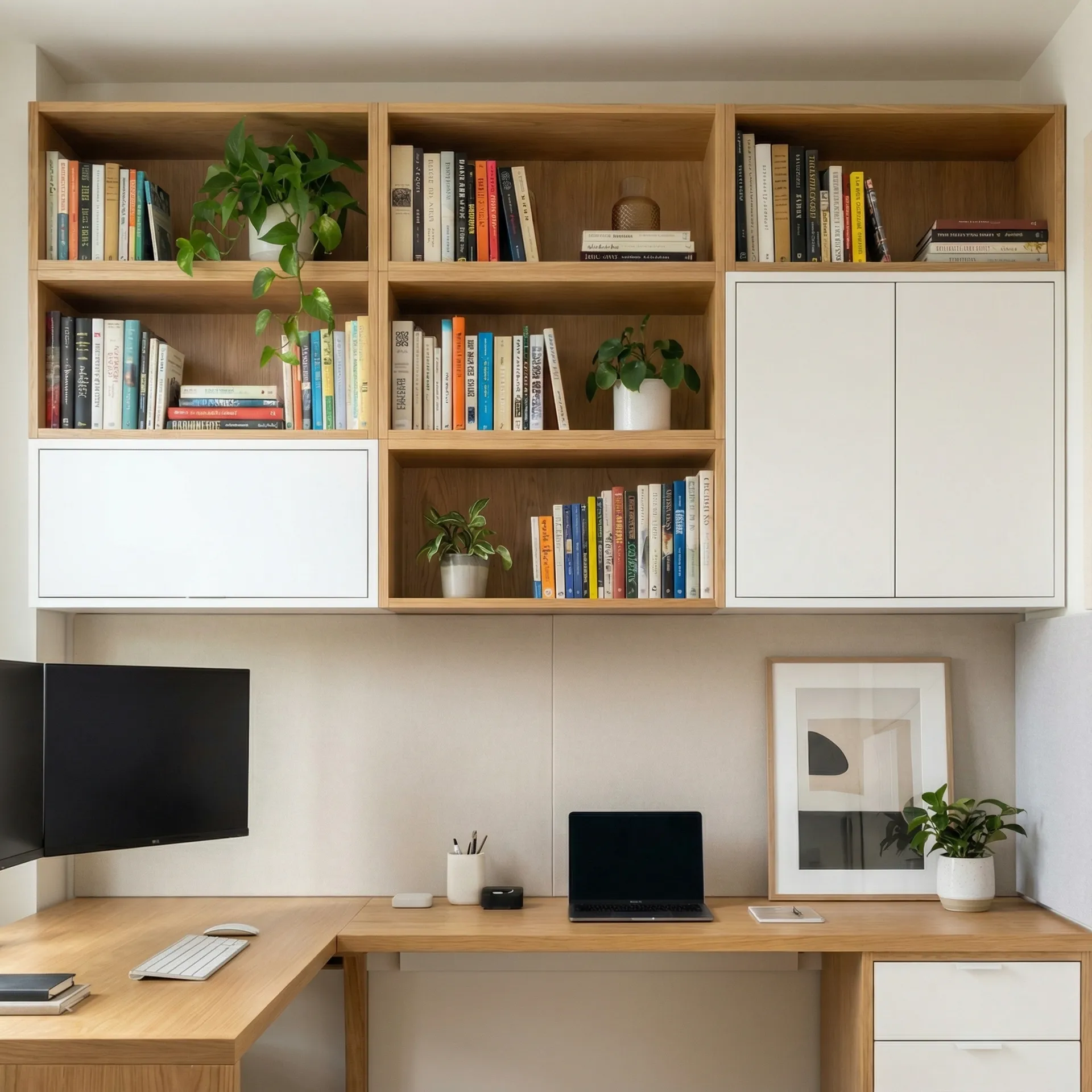 Zidne police kombinuju otvorene segmente od hrasta za knjige i biljke sa zatvorenim belim elementima za arhivu i opremu. Raspored je osmišljen da pruži profesionalnu pozadinu za video pozive.