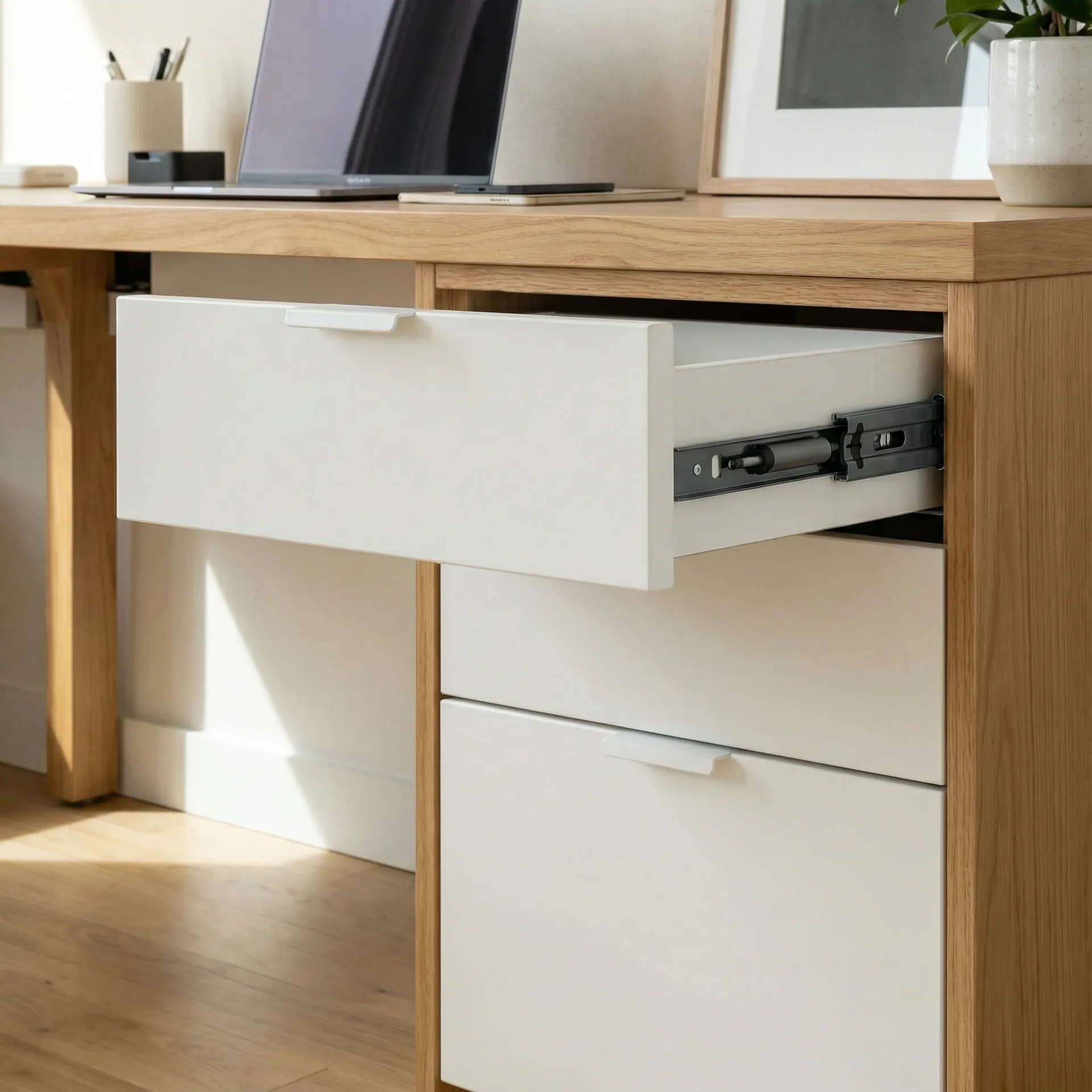 Funkcionalna kućna kancelarija sa L radnim stolom od hrasta koji pruža dovoljno prostora za monitor, laptop i dokumente. Beli kontejner sa fiokama obezbeđuje organizovano odlaganje kancelarijskog materijala.