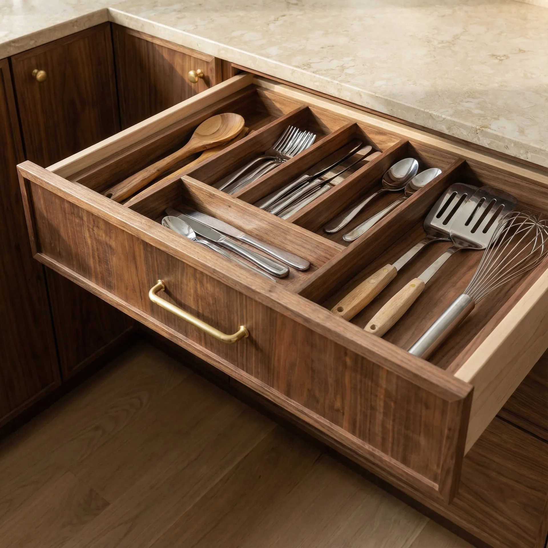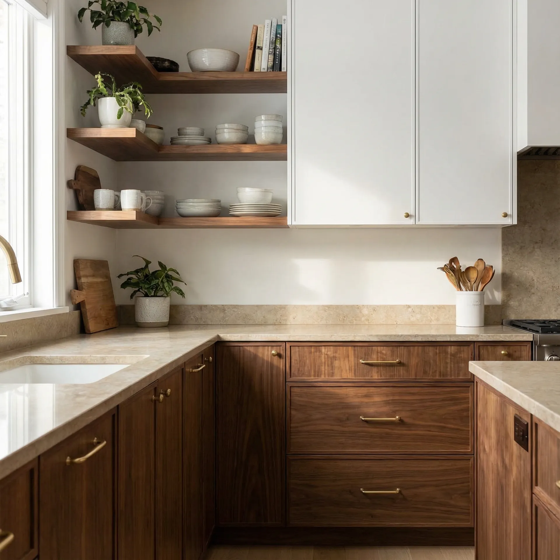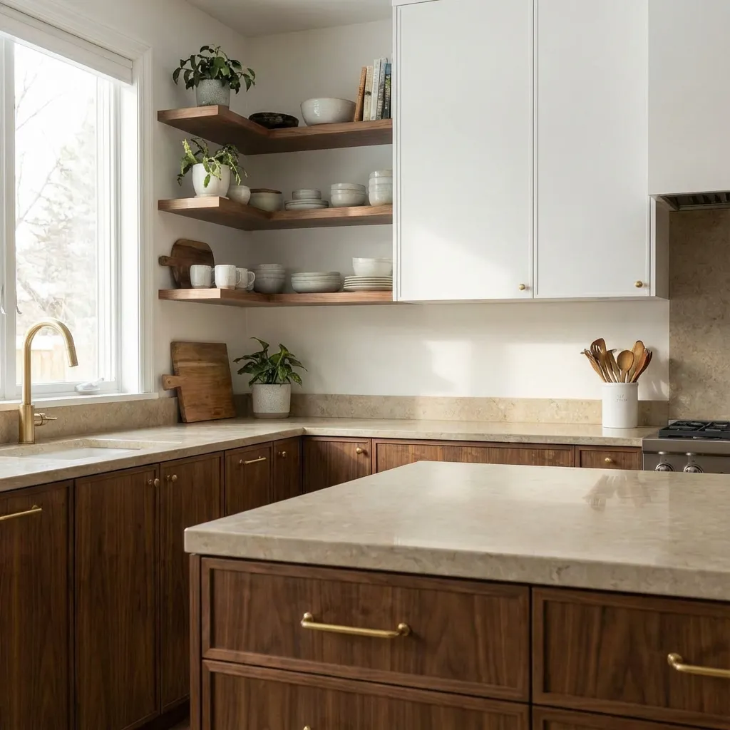 Otvorene police od orahovine u uglu služe za svakodnevno posuđe i dekorativne predmete, dok radna ploča od svetlog granita pruža izdržljivu i laku za održavanje površinu.