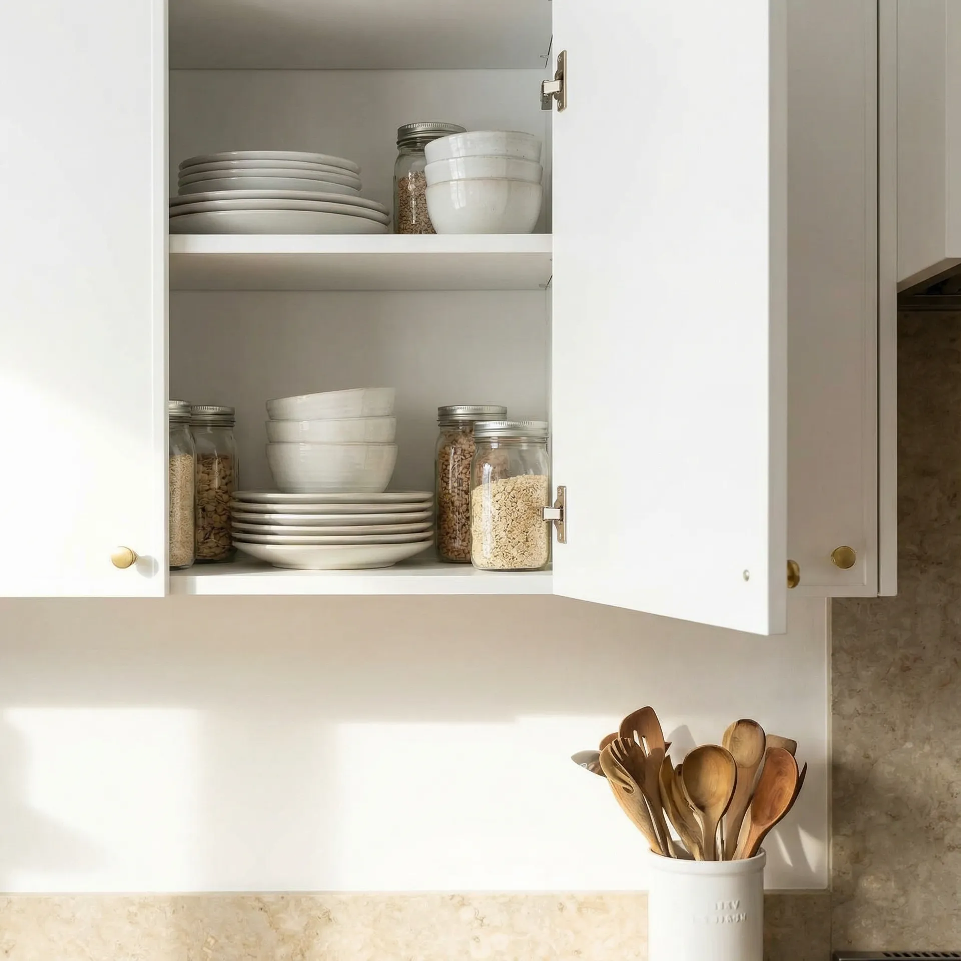 Fioke sa drvenim organizatorima obezbeđuju pregledno odlaganje escajga i kuhinjskog pribora. Kombinacija toplih drvenih tonova i bele boje stvara prijatan, porodičan ambijent.
