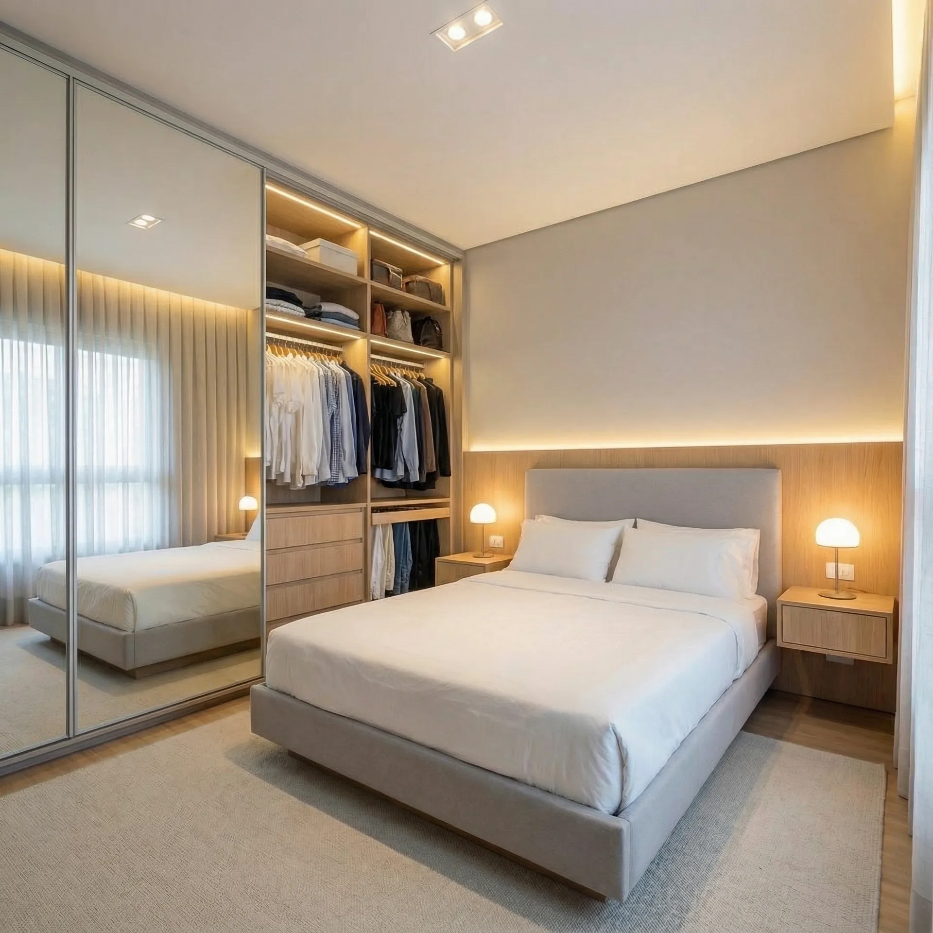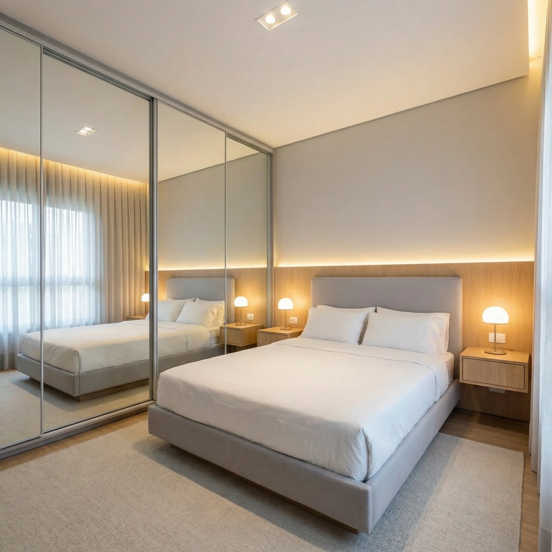 Moderna spavaća soba sa kliznim ormarima koji imaju vrata sa ogledalom punog formata, optički udvostručujući prostor. Tapcirano sivo uzglavlje sa integrisanim LED osvetljenjem stvara toplu atmosferu.