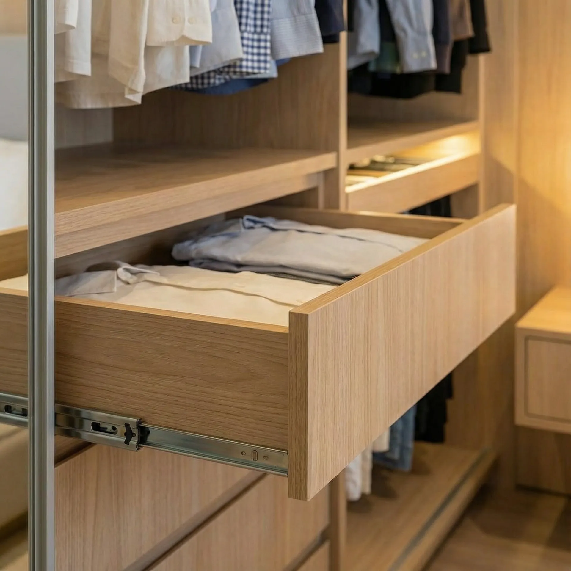 Unutrašnjost ormara od hrasta pažljivo je organizovana sa kombinacijom šipki za vešanje, polica i fioka sa punim izvlačenjem. LED osvetljenje unutar ormara olakšava izbor garderobe.