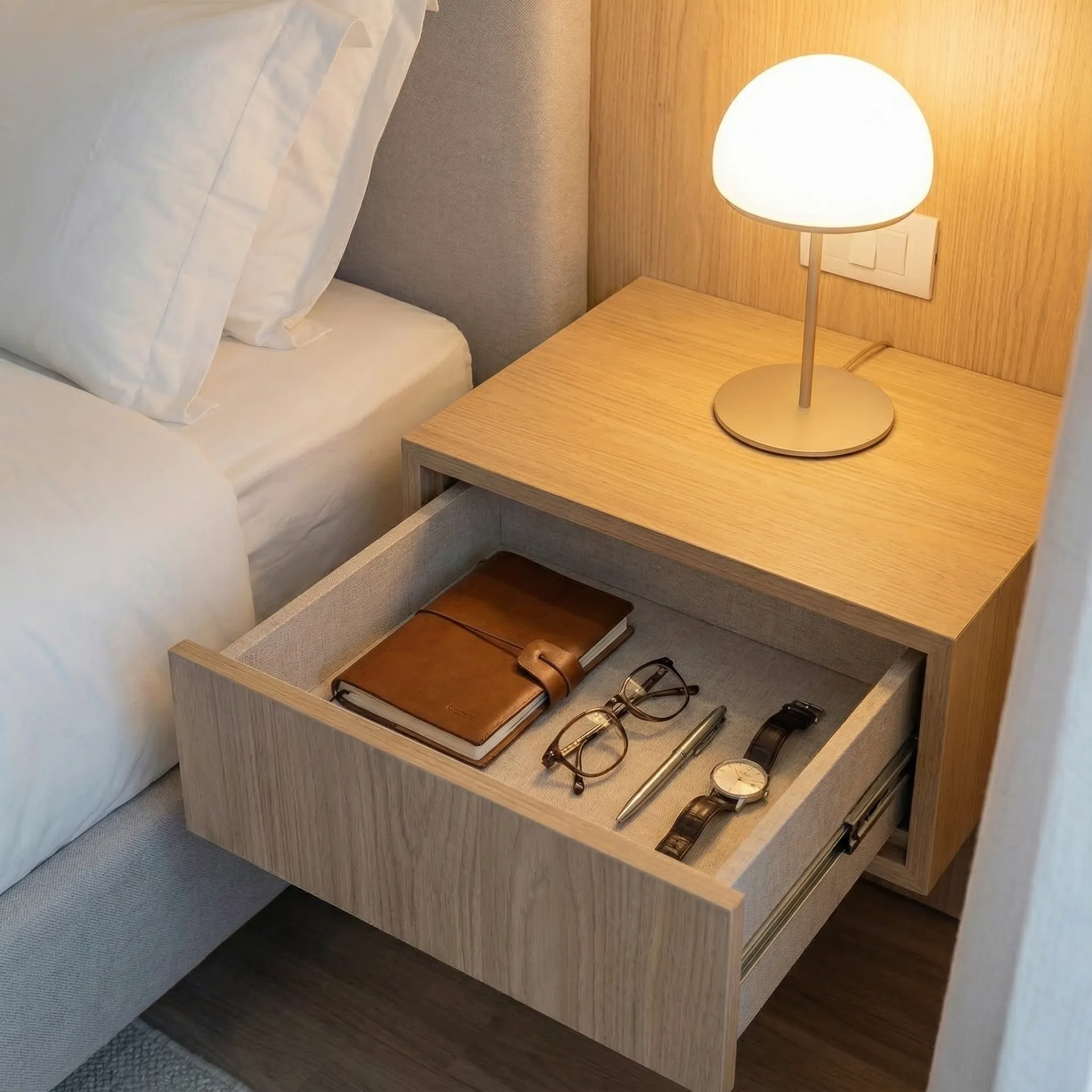 Lebdeći noćni ormarići od hrasta sa fiokama za sitnice upotpunjuju funkcionalnost. Neutralna paleta boja - bela, siva i drvo - stvara miran i opuštajući ambijent za odmor.